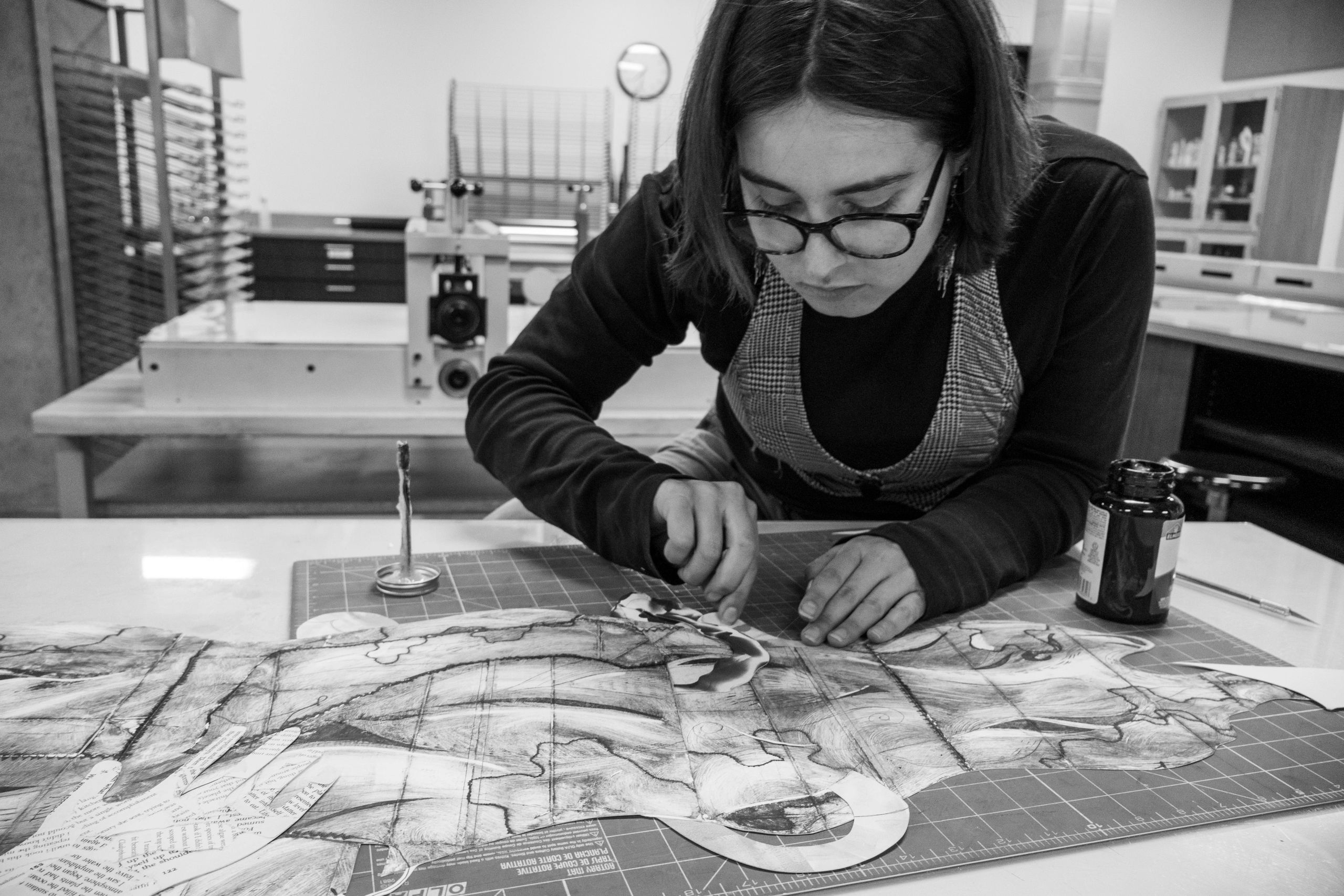 Mya's printmaking journey began in the Mache-Chidul Forest in Ecuador studying biodiversity and finding the power of storytelling through stamps.
